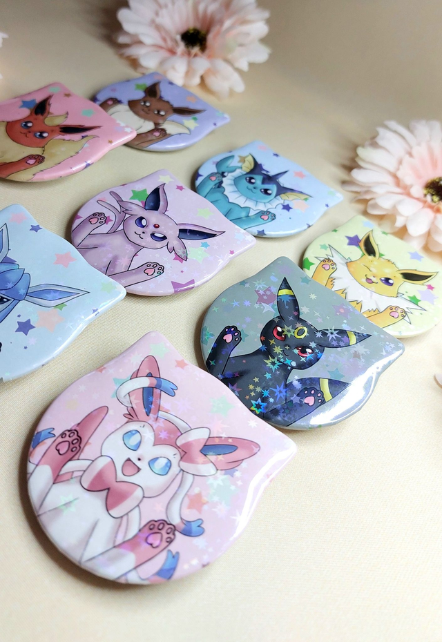 Zeig der Welt deine liebste Evoli-Entwicklung ♡ oder ist es Evoli selbst? Mit diesen schönen Katzenbuttons inkl. funkelnder Sternchenfolie in den Designs aller Entwicklungen.