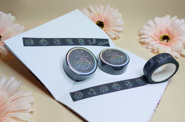 Auf diesem Washitape findet ihr die Würfel, die typischerweise bei Pen und Paper Spielen wie DnD (Dungeons and Dragons) verwendet werden sowie der Spruch 'Roll Initiative'